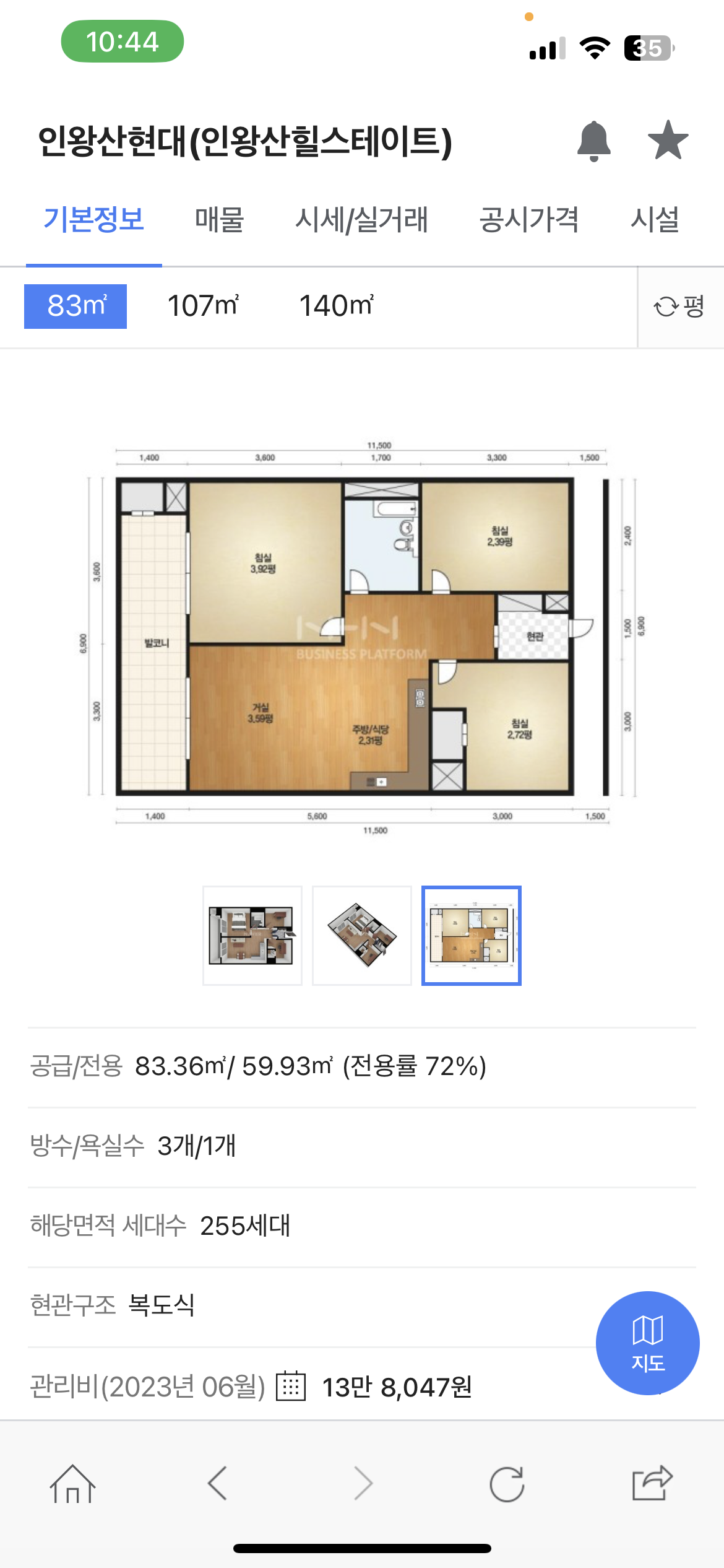 서울시 서대문구 인왕산힐스테이트 복도식 아파트이며, 공급면적은 83.36으로 방3, 화1, 베란다 구조입니다.